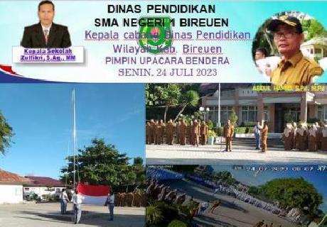 SMA Negeri 1 Bireuen melaksanakan kegiatan Upacara Bendera Pada hari senin, 24/07/2023 di ikuti oleh seluruh dewan guru dan staff tata Usaha serta para Siswa siswi Kelas XII, XI dan X dilaksanakan di Halaman SMA Negeri 1 Bireuen yang bertindak sebagai pelaksana upacara Bendera adalah Anggota Osis, Anggota Purna Paskibra Sekolah&n...