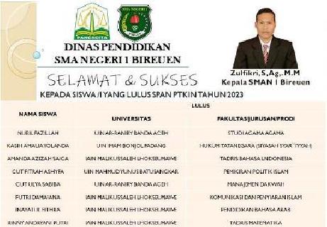 Hasil Seleksi Prestasi Akademik Nasional Perguruan Tinggi Keagamaan Islam Negeri (SPAN-PTKIN), Telah diumumkan serentak pada tanggal, 3 April 2023 Alhamdulillah, SMA Negeri 1 Bireuen Lulus Seleksi Prestasi Akademik Nasional Perguruan Tinggi Keagamaan Islam Negeri (SPAN-PTKIN) Tahun Pelajaran 2022/2023 Berhasil Lulus 9 siswa/i Orang dari Pen...