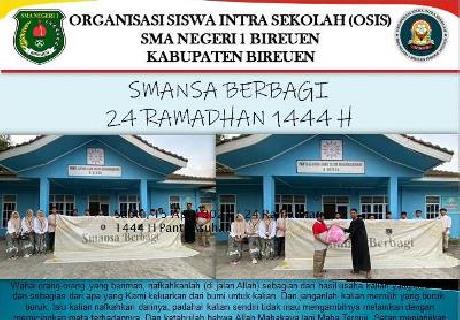 Smansa Berbagi. Sudah menjadi tradisi setiap kali di bulan suci Ramadhan, hamba Allah yang mampu selalu menyempatkan diri menyantuni anak yatim agar kehidupan sehari-hari diberkahi dan seluruh urusan di lancarkan. Seperti yang di tunjukkan oleh Organisasi Siswa Intra Sekolah (Osis) Sekolah Menengah Atas Negeri (SMAN) 1 Bireuen, menyantuni anak yatim di Panti asuhan An...