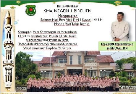 اَلسَّلاَمُ عَلَيْكُمْ وَرَحْمَةُ اللهِ وَبَرَكَاتُهُ Kami Segenap Keluarga BesarSMA NEGERI 1 BIRUEN Dengan segala kerendahan hati, Kepala SMA Negeri 1 Bireuen Zulfikri, S,Ag., M.Mmengucapkan Selamat Hari Raya Idul Fitri 1444 H,Taqabbalallahu minna wa minkum taqabbal yaa kariim, wa ja’alanaallaahu wa iyyaakum minal ‘aaidin...