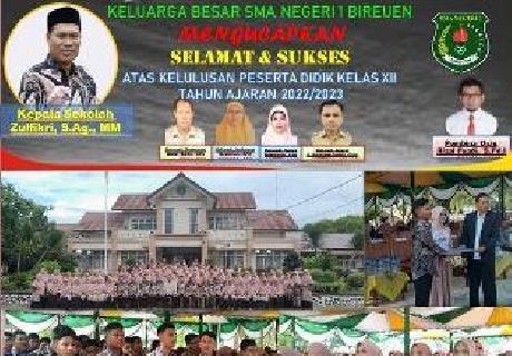 Berdasarkan Hasil Rapat Dewan Guru SMA Negeri 1 Bireuen yang di adakan Pada Hari Selasa, Tanggal 02 Mei 2023 Nomor : 421.3/197/2023 Telah menetapkan Kelulusan Peserta Didik Tahun Pelajaran 2022/2023 Berdasarkan Kriteria yang berlaku di sekolah. Berikut Daftar Peserta Yang Dinyatakan LULUS Dari SMA Negeri 1 Bireuen Tahun Pelajaran 2022/2023 PENGUMUMAN KELULUSAN SISWA KELAS XII TP....