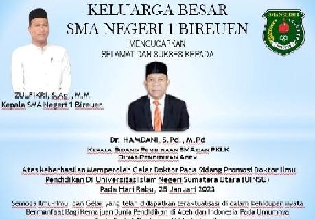 KELUARGA BESAR SMA NEGERI 1 BIREUEN MENGUCAPKAN SELAMAT DAN SUKSES KEPADA Dr. HAMDANI, S.Pd., M.Pd Kepala Bidang Pembinaan SMA dan PKLK Dinas Pendidikan Aceh Atas keberhasilan Memperoleh Gelar Doktor Pada Sidang Promosi Doktor Ilmu Pendidikan Di Universitas Islam Negeri Sumatera Utara (UINSU) Pada Hari Rabu, 25 Januari 2023 Semoga Ilmu-ilmu dan Gelar yang telah didapatkan...