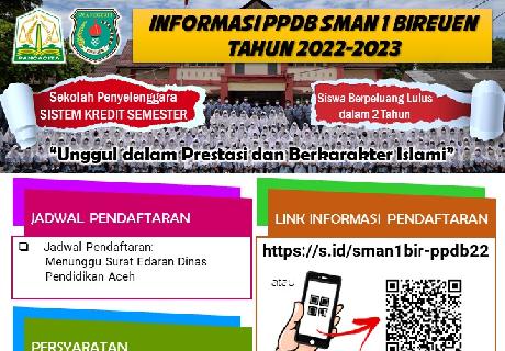 INFORMASI PPDB SMAN 1 BIREUEN TAHUN 2022-2023 PENDAFTARAN PERSERTA DIDIK BARU (PPDB)TAHUN AJARAN 2022-2023 A. PROGRAM UNGGULAN PROGRAM TAHSIN DAN TAHFIZH AL QURAN PROGRAM SISTEM KREDIT SEMESTER 11 ORGANISASI EKSTRAKURIKULER B. JADWAL PENDAFTARAN Pendaftaran Online: (Menunggu Surat Edaran Dinas Pendidikan Aceh) Verifikasi Berkas: (Menunggu Surat Edaran Dinas Pendidikan...