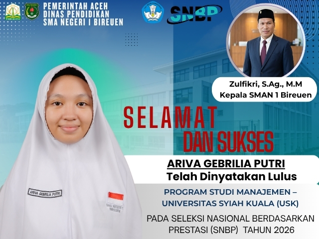 Sabet Puluhan Kursi Jalur Prestasi, SMA Negeri 1 Bireuen Ukir Prestasi Gemilang di SPAN-PTKIN dan Poltekkes Kemenkes 2026 Keluarga besar SMA Negeri 1 Bireuen kembali menorehkan tinta emas di dunia pendidikan...