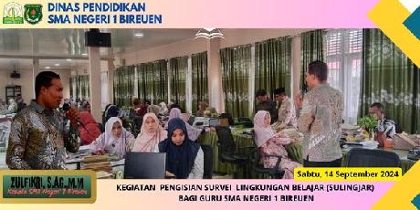 Kegiatan Pengisian Survei Lingkungan Belajar (SULINGJAR) di SMA Negeri 1 Bireuen adalah salah satu langkah nyata dalam komitmen sekolah untuk terus berinovasi dan meningkatkan kualitas pendidikan. Dengan adanya partisipasi aktif dari seluruh guru, diharapkan lingkungan belajar di sekolah ini akan semakin optimal dan mendukung proses belajar mengajar yang lebih baik.