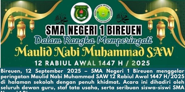 ""Bireuen, 12 September 2025 – SMA Negeri 1 Bireuen menggelar peringatan Maulid Nabi Muhammad SAW 12 Rabiul Awal 1447 H/2025 di halaman sekolah dengan penuh khidmat. Acara ini dihadiri oleh seluruh dewan guru, staf tata usaha, serta seribuan siswa-siswi SMA Negeri 1 Bireuen.